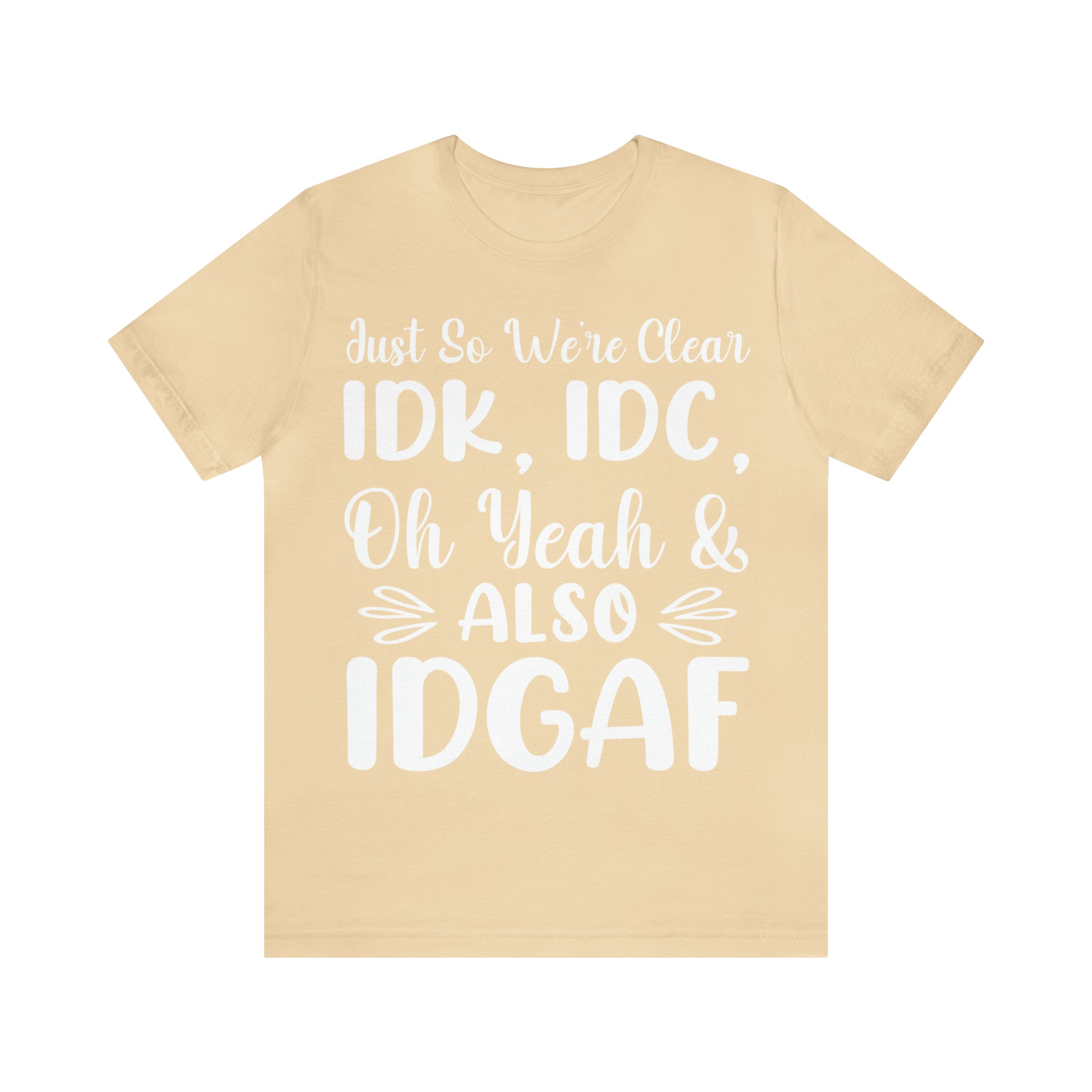 Display your unique style with our playful IDC, IDK, IDGAF Short Sleeve Tee! Turn heads and bring joy to everyone you meet with this one-of-a-kind tee. Let your individuality shine through and share your passions with a shirt that speaks your mind. Get ready for conversations and laughter!