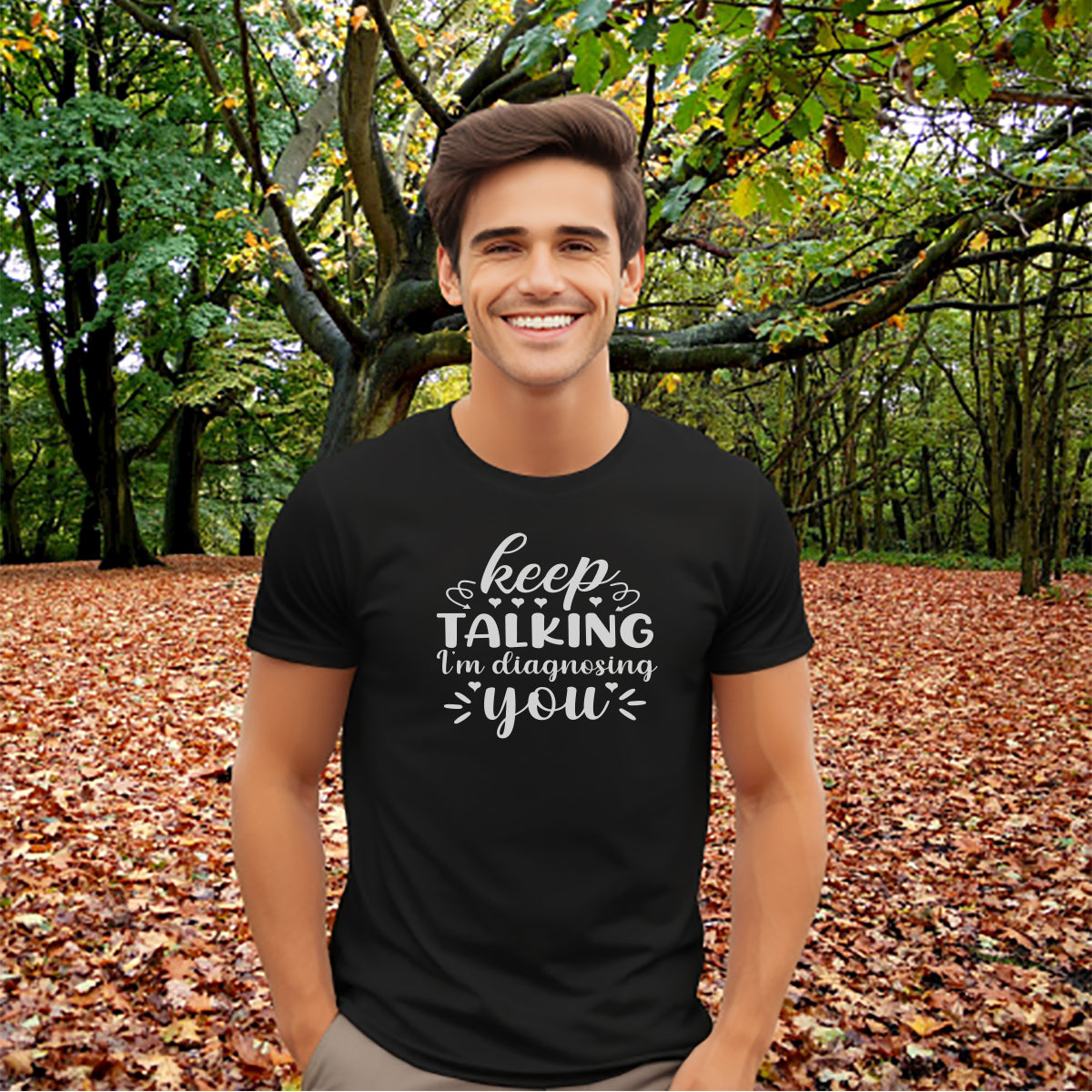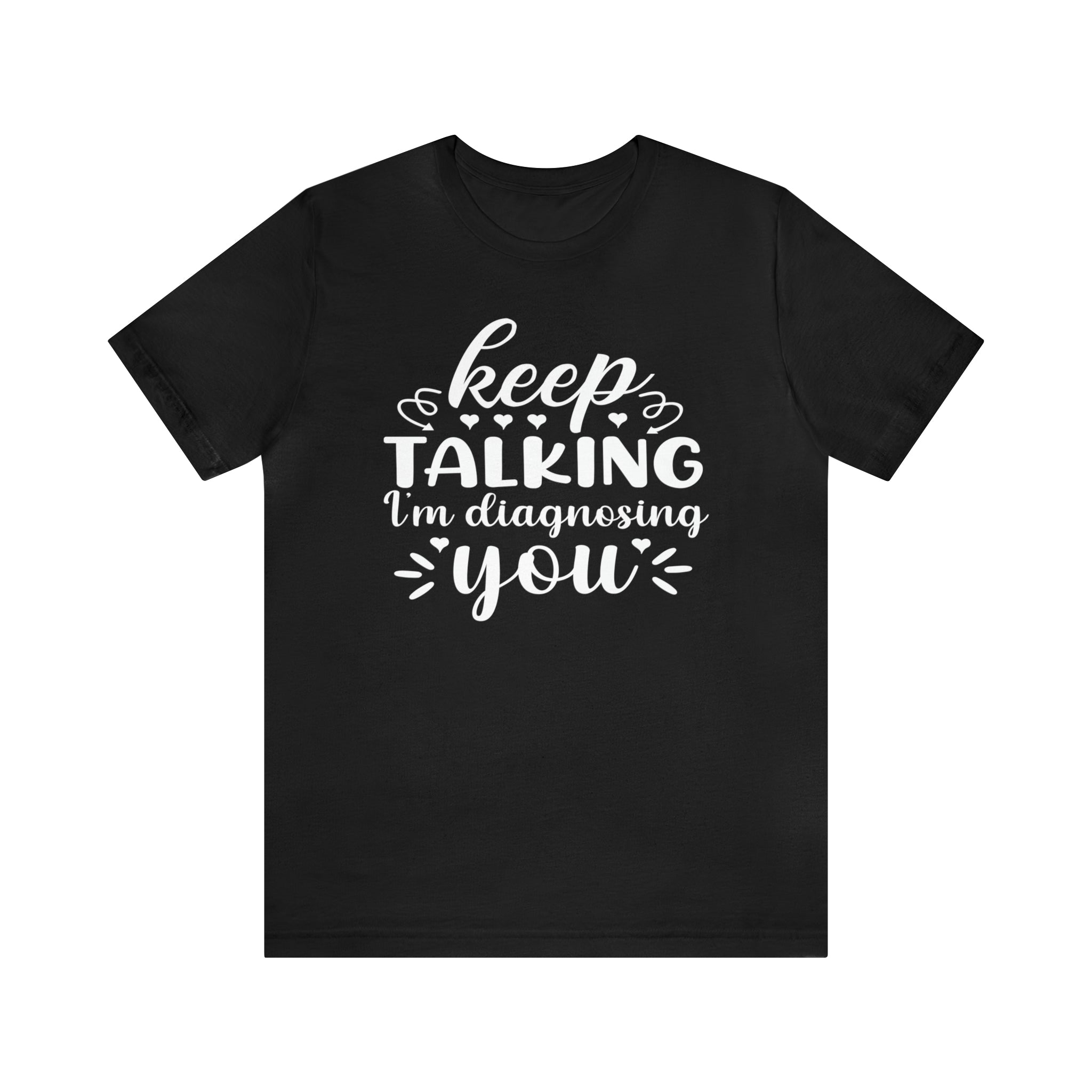 Turn heads and get ready to make a statement with our witty Keep Talking I'm Diagnosing You Short Sleeve Tee! Show off your passions and personality in style, and experience the joy of being the center of attention. You'll be sure to start conversations and spark endless laughter!
