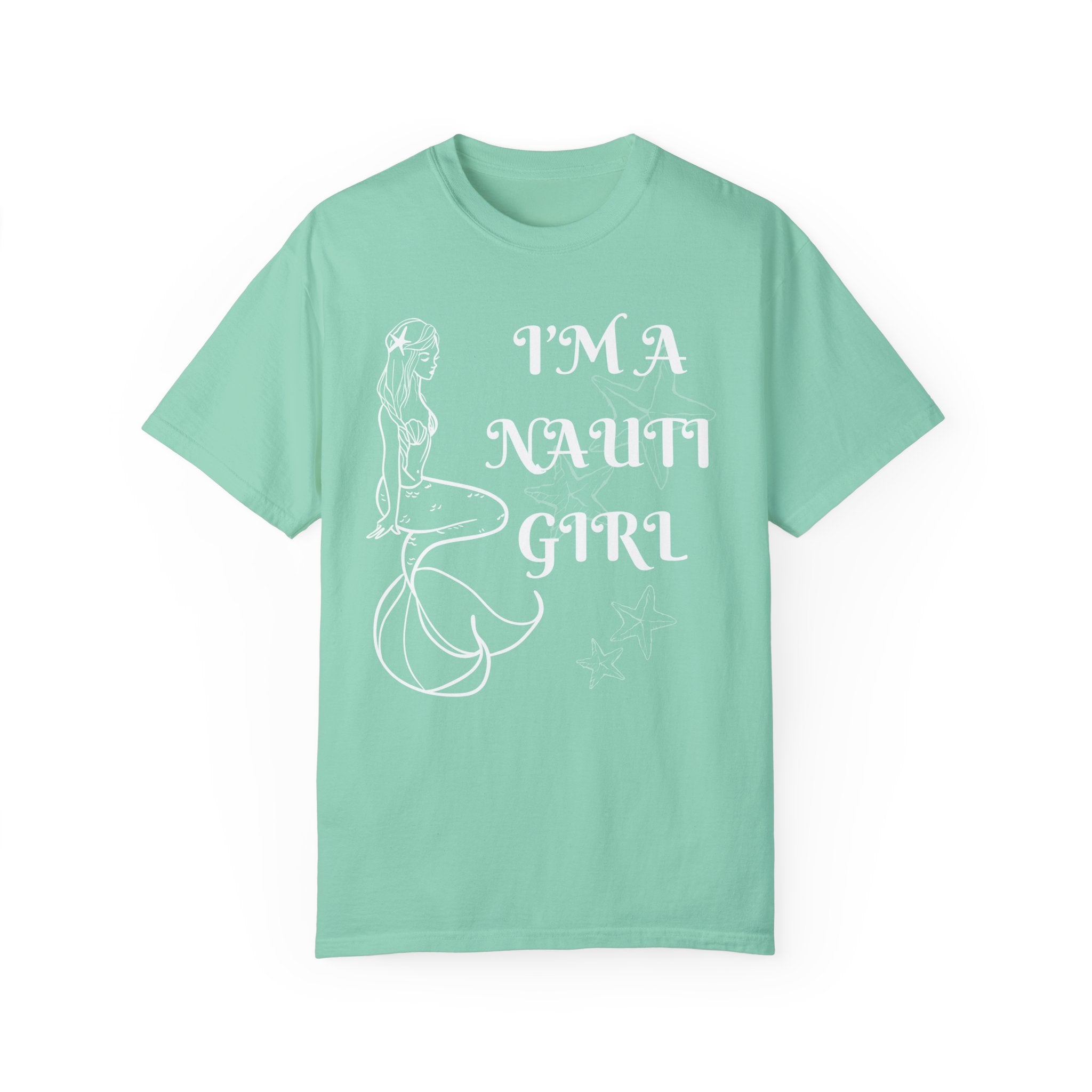 Set sail on a sea of style with the "Seaside Sass" Tee. For the woman who's nautical by nature and naughty by choice, this tee is a playful nod to your free-spirited side. Adorned with a sassy mermaid graphic and the clever pun "I'm A Nauti Girl," it's the perfect blend of comfort and cheek. Whether you're basking on the deck or beachside, let your personality shine as bright as the ocean sun 🌞.