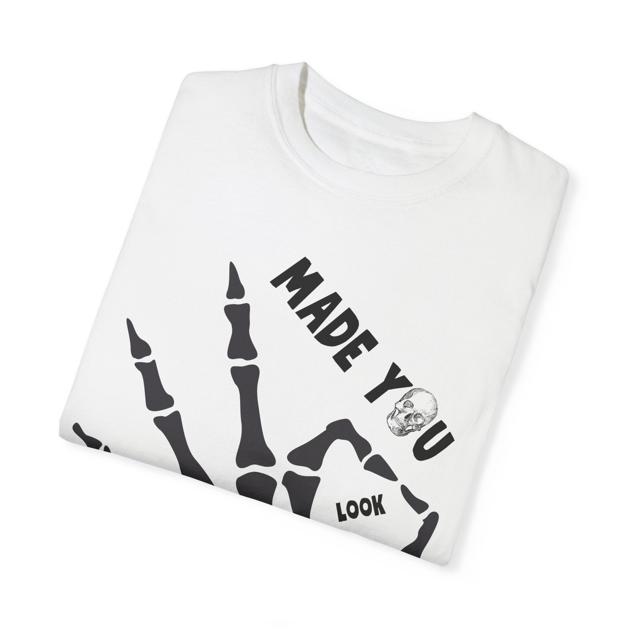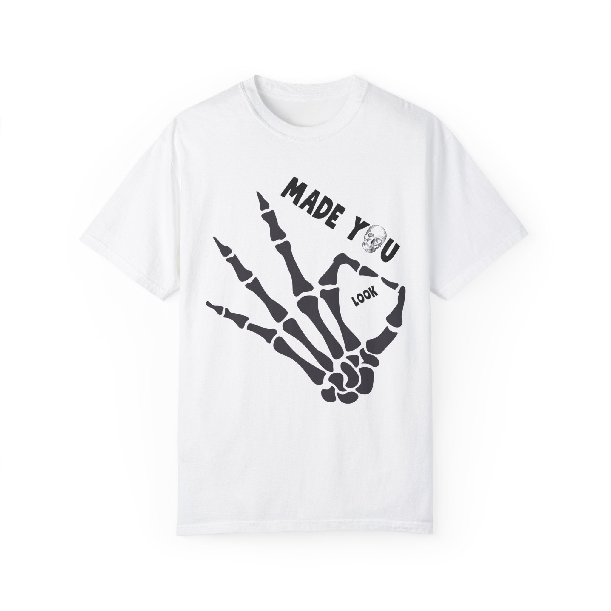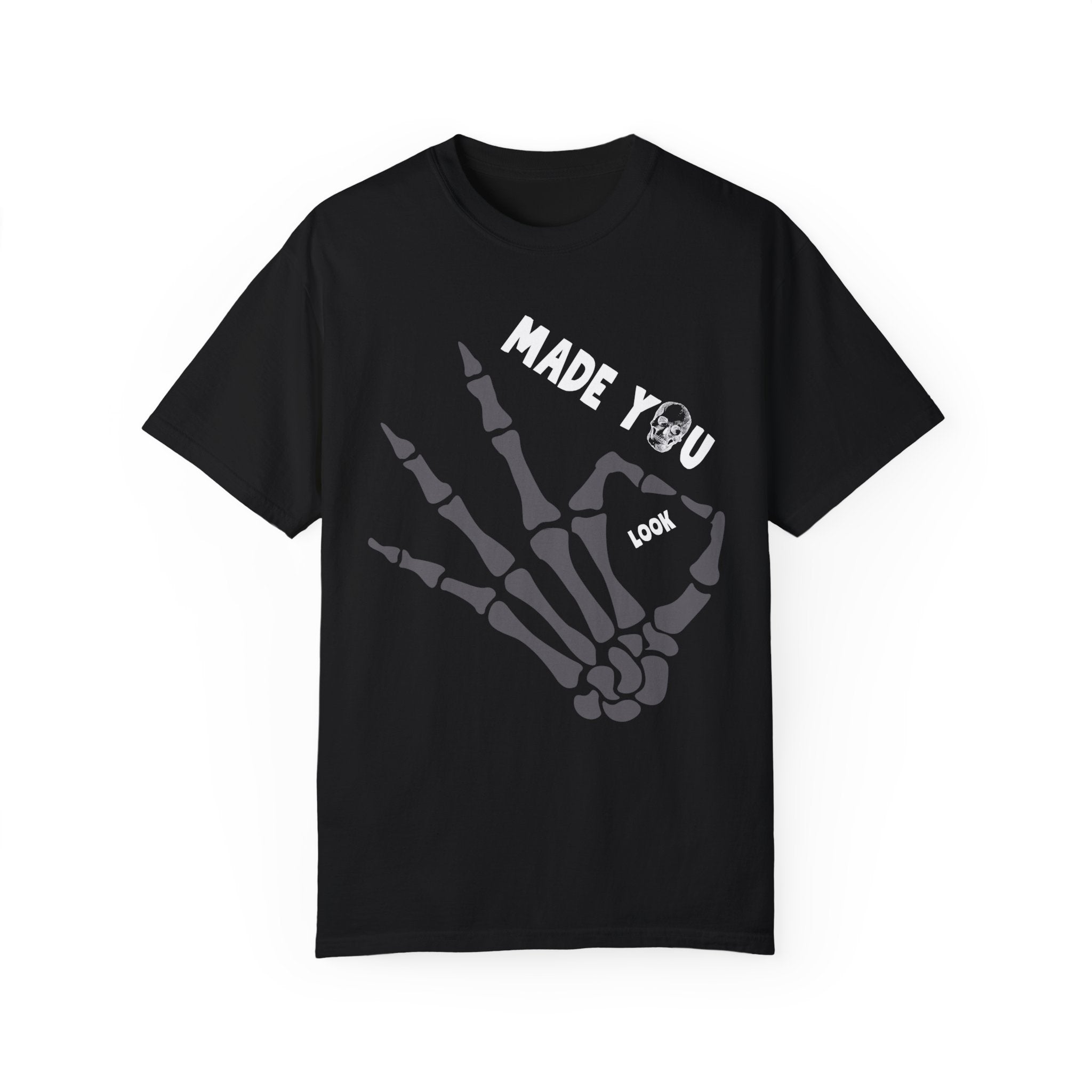 Unleash your playful side with the "Sneaky Peek" Skeleton Hand tee, a shirt that's all about the cheeky fun of a harmless prank. This tee isn't just a garment; it's a conversation starter, a laughter generator, and a nod to the jokers at heart. With a design as simple as it is clever, it turns every wear into an opportunity for a shared smile and a light-hearted jest. Perfect for those who love to inject a bit of humor into the everyday, it's a wearable trick that's sure to become a wardrobe treat.